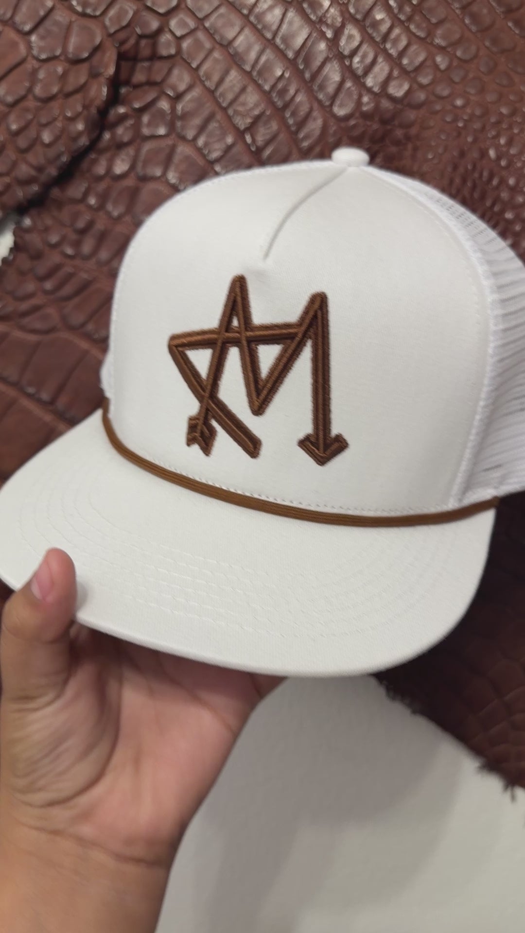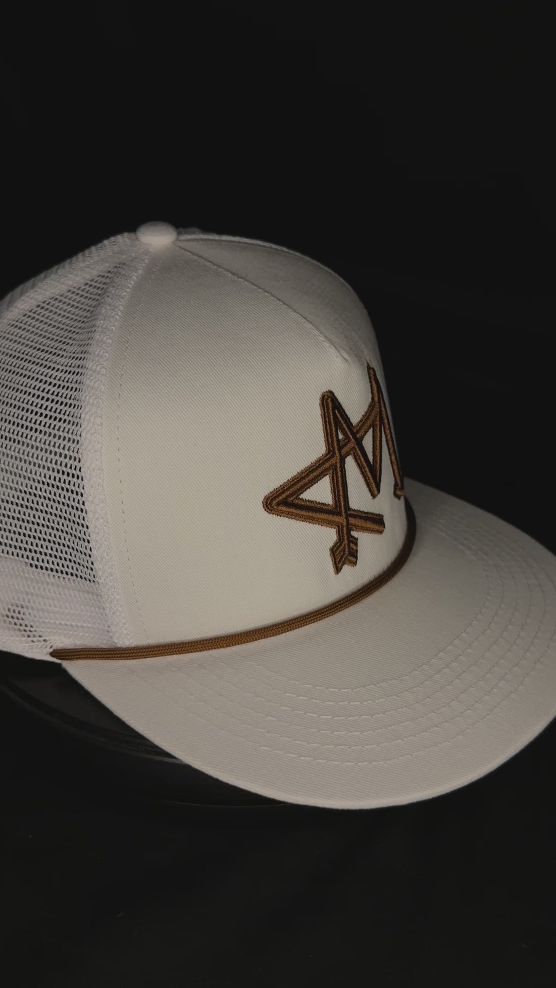 The Yupoong SnapBack cap features a durable construction with a white front and white mesh for breathability. It includes a prominently embroidered 3D AM logo and a brown rope accent. This cap combines style and functionality, making it suitable for various outdoor activities and everyday wear.